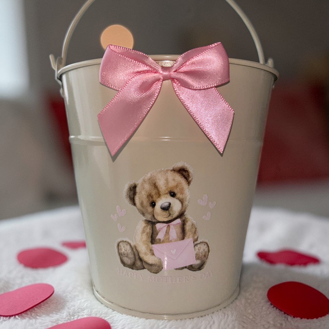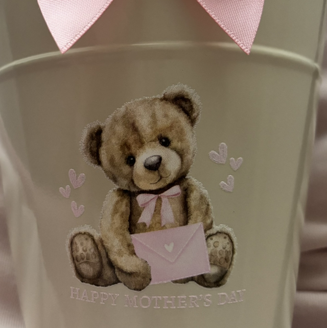 Cream Coloured plant pot, featuring a cute teddy design with the words Happy Mothers Day underneath.